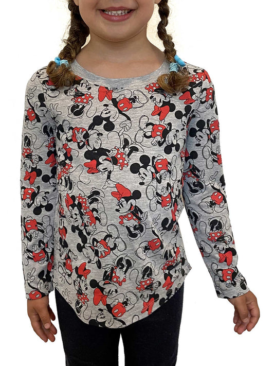 Girls Disney Minnie & Mickey Mouse T-Shirt Long Sleeve AOP Gray Red Size Small
