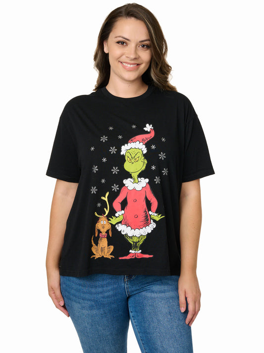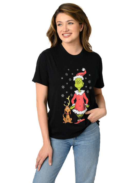 Women's and Women's Plus Dr. Seuss Grinch & Max T-Shirt Christmas Holiday Black