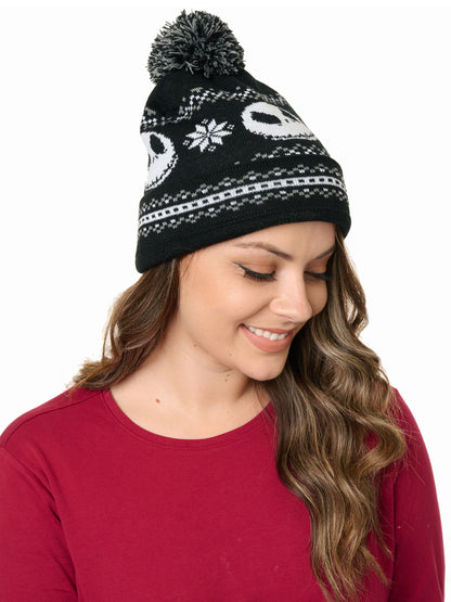 Beanie Hat features a Fair Isle print of Jack Skellington face and snowflakes around the beanie. Includes a Pom-Pom on top of the beanie.