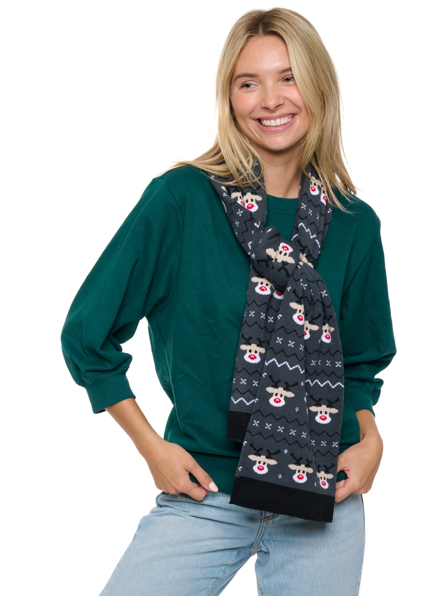 - Christmas knit scarf features a fair Isle print and large reindeer icons on both the front and back with a black border across the bottom.
