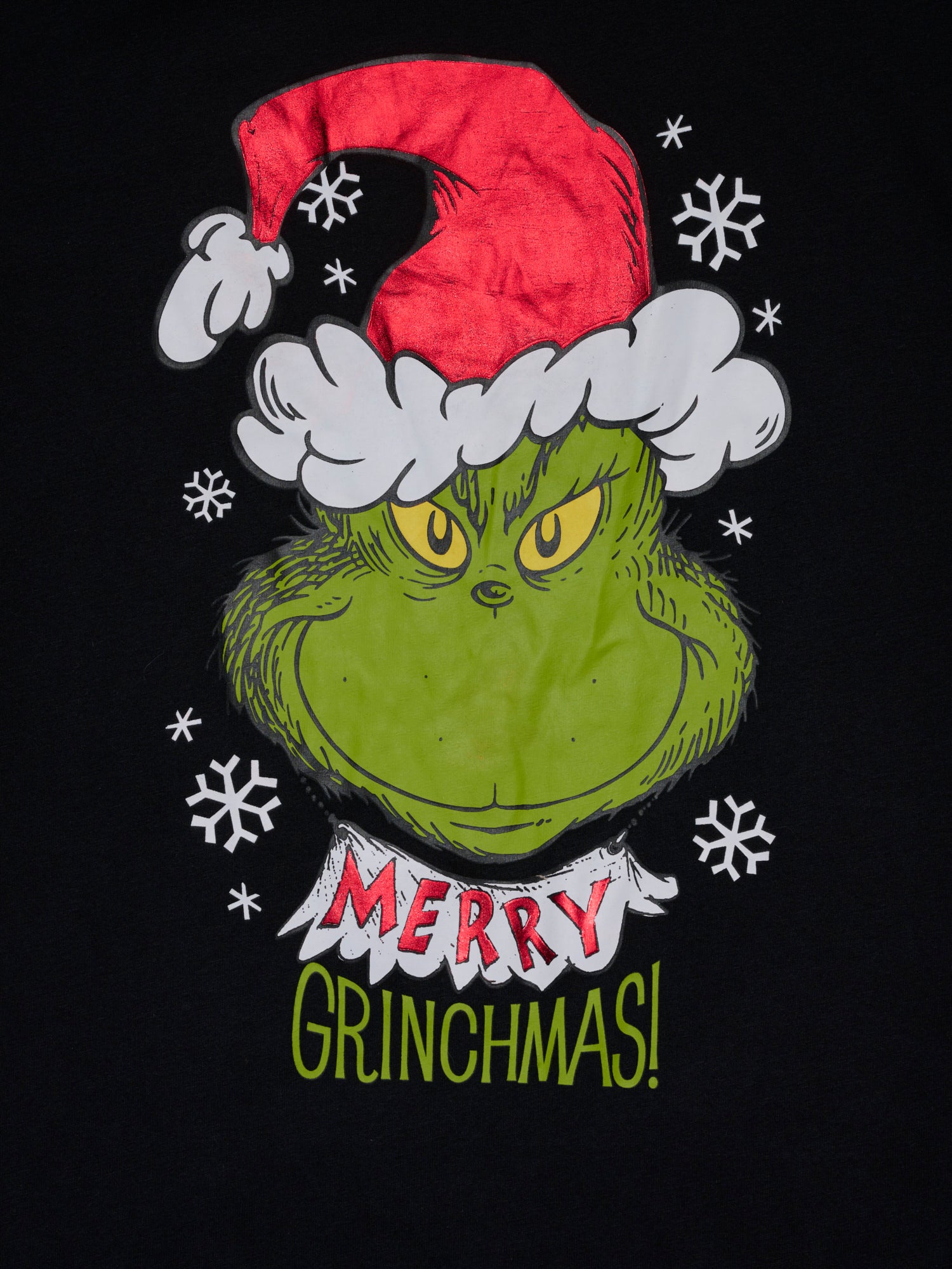 - This Grinch sleep shirt features a large graphic print of the Grinch wearing a Santa hat. Text reads "Merry Grinchmas".